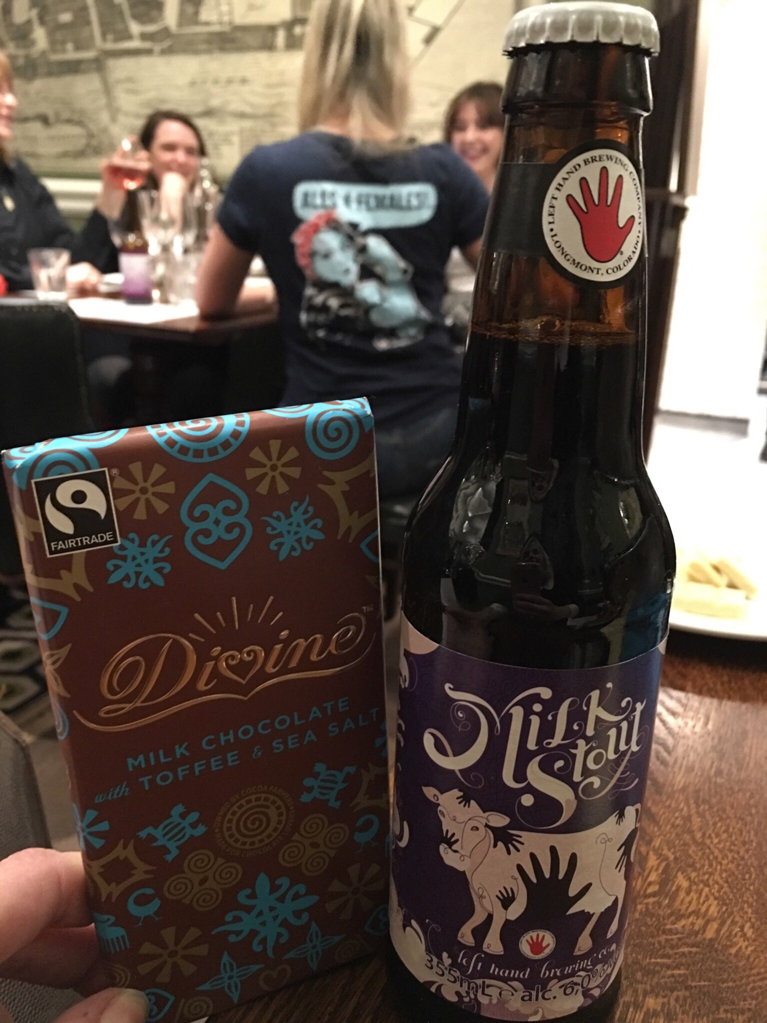 I was particularly taken with the Erdinger paired with the White Green and Blacks chocolate. The slight banana tinge of this beer seemed to really complement and intensify the creaminess of the white chocolate. The winning combo for the evening, which I knew I’d also love, was the Left Hand Brew Co. Milk Stout coupled with Salted Caramel and Sea Salt Divine Chocolate. The chocolate and beer individually are so delectable but together – BOOM, what a combination!